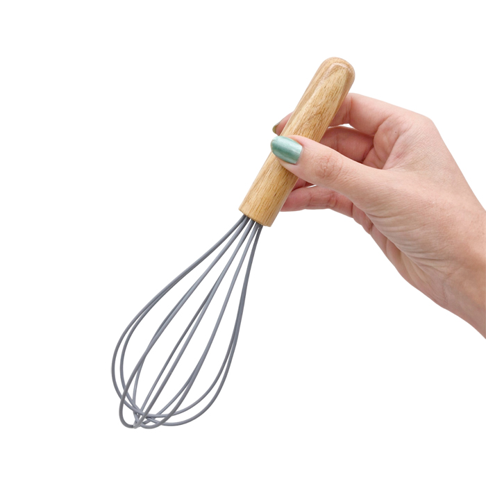 Set x 12 utensilios de silicona chicos con mango de madera y vaso contenedor.