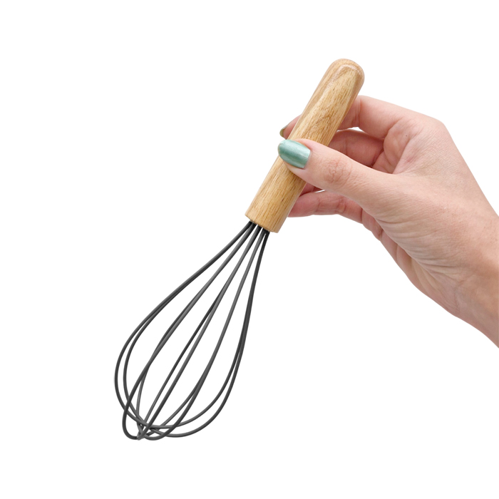 Set x 12 utensilios de silicona chicos con mango de madera y vaso contenedor.