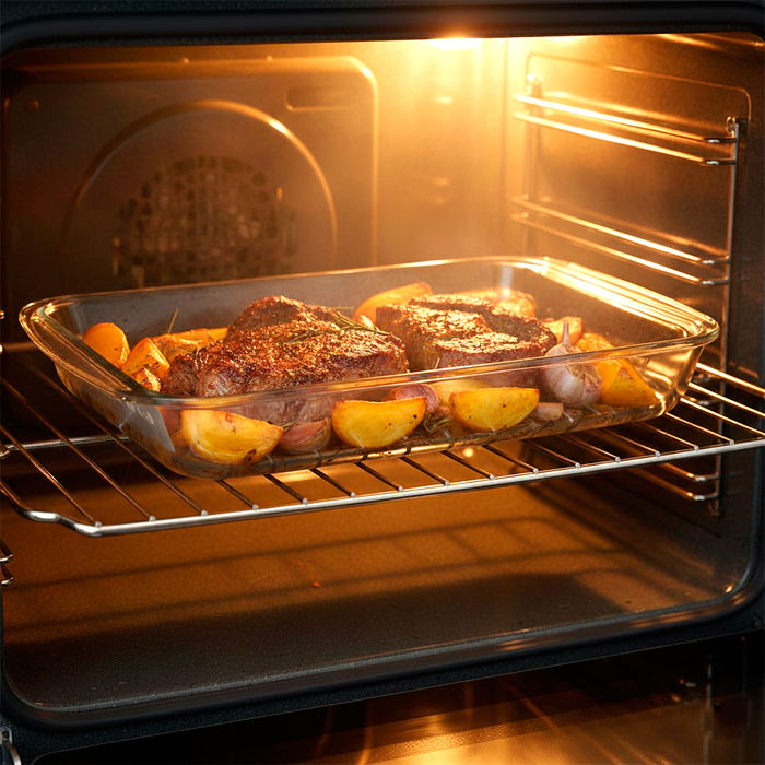 Fuente / Asadera baja de vidrio templado rectangular.