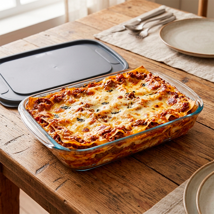 Asadera rectangular de vidrio de borosilicato con tapa de plástico