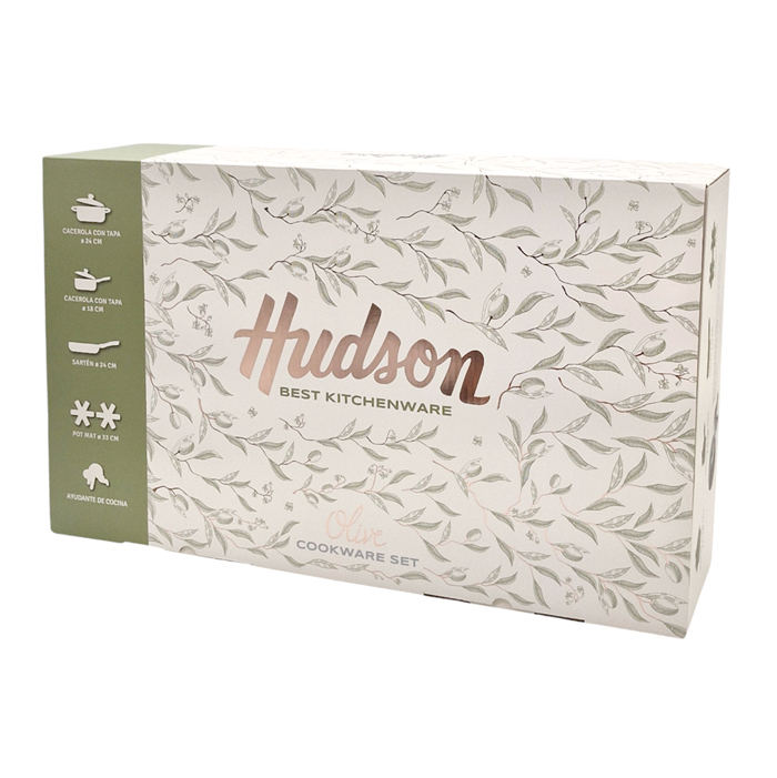Incluye Cacerola de 24cm, cacerola con mango de 18cm y sartén de 24cm. Además 2 pot mats (lienzos separadores) de 33cm y 1 ayudante de cocina de silicona.