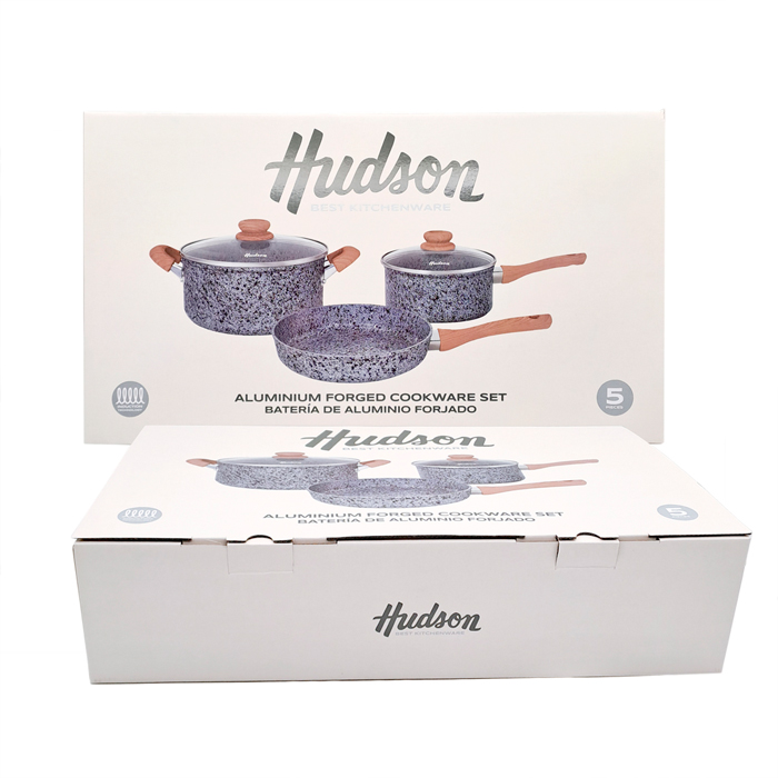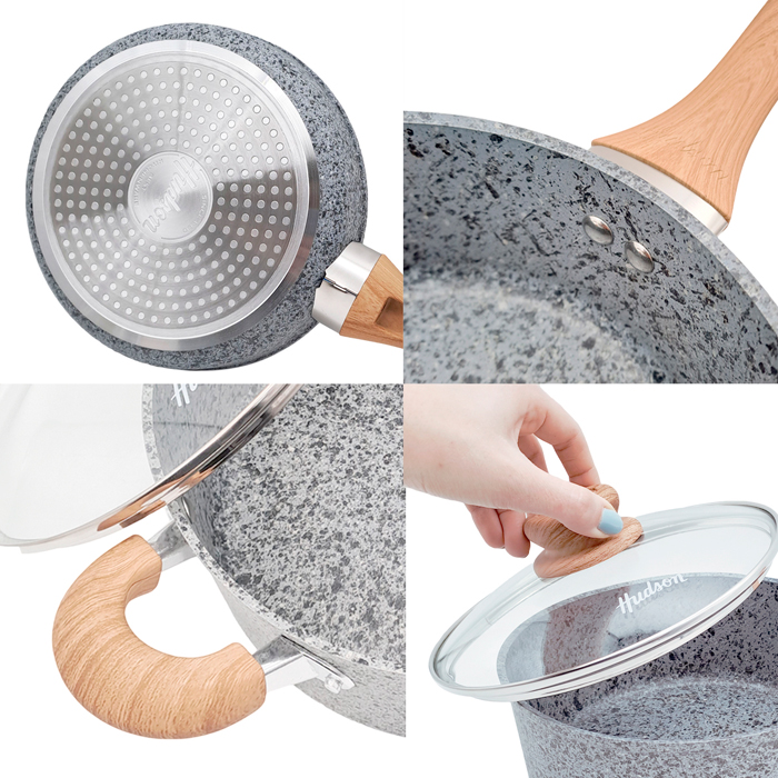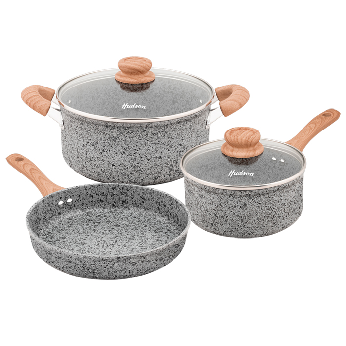 Batería línea Stone forjado de 5 piezas con triple capa antiadherente, tapas de vidrio con valvula de vapor y mango/asas revestidas con pintura siliconada símil madera.