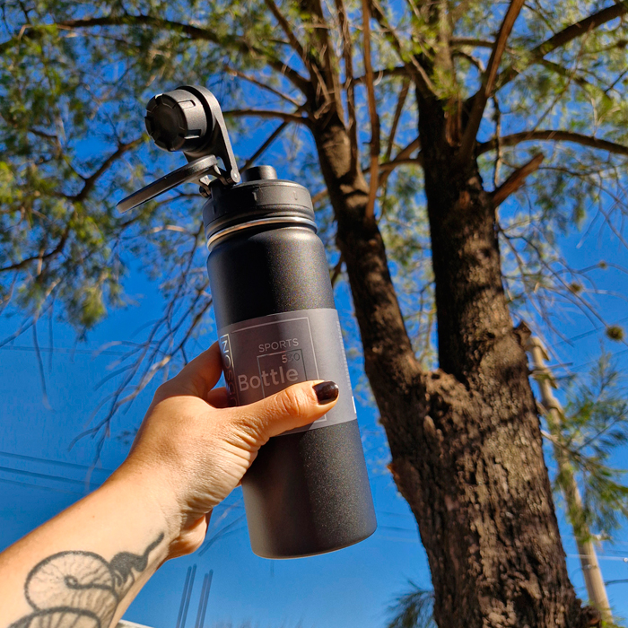 Termo deportivo con base de silicona, tapa a rosca y manija de agarre.