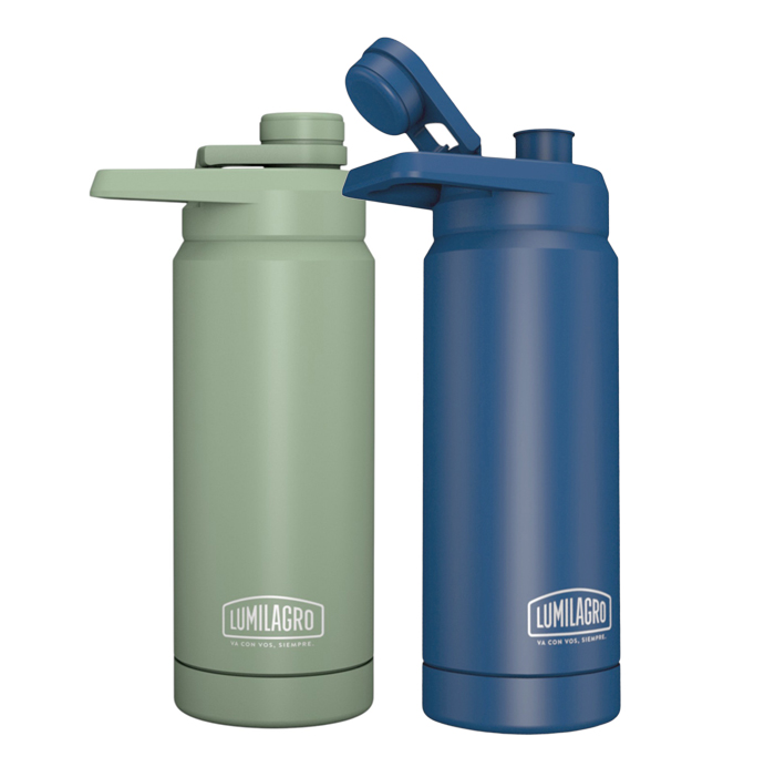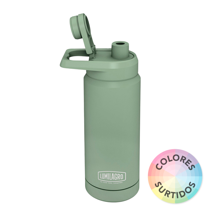 Botella térmica de doble pared de acero inoxidable 304 y exterior pintado. Con tapón siliconado a rosca y pico plástico. Con manija para llevar, diseño práctico y compacto. Base con silicona antideslizante. Hermético. Apto frío, calor y hielo.