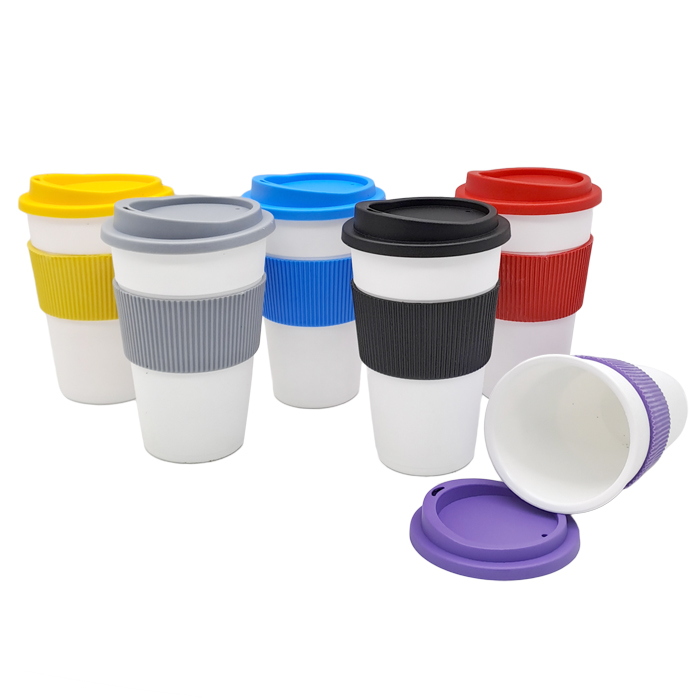 Vaso térmico tipo starbucks de plástico con tapa plástica y banda de silicona.