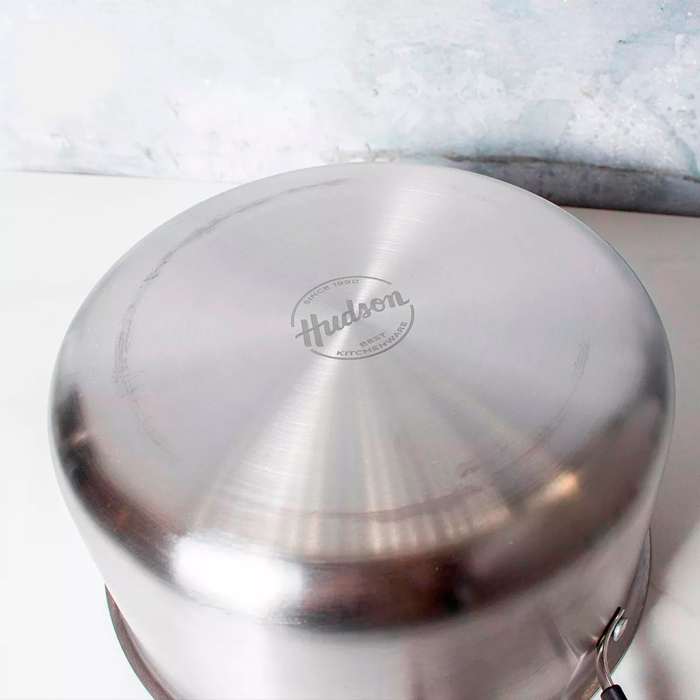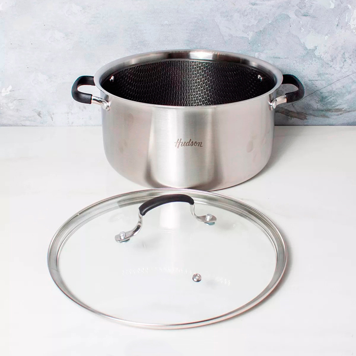 Cacerola de acero inoxidable con asas de acero inoxidable, triple fondo, tapa de vidrio con válvula de vapor y revestimiento antiadherente, con trama de panal de abejas que ayuda a la conducción del calor.