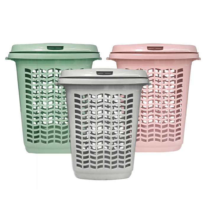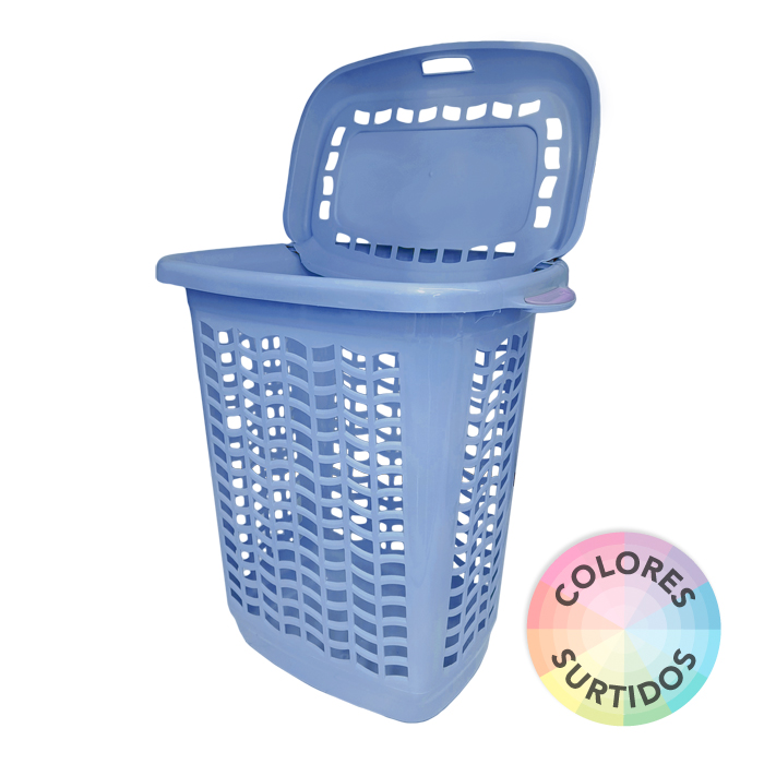 Canasto de plástico calado con tapa rebatible.
