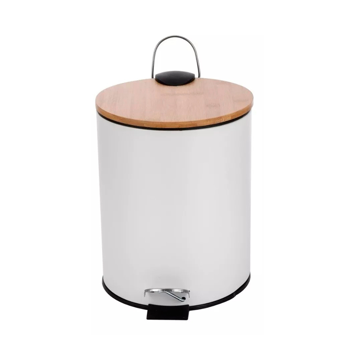 Cesto de residuos de acero inoxidable con pedal y tapa de bambu.
