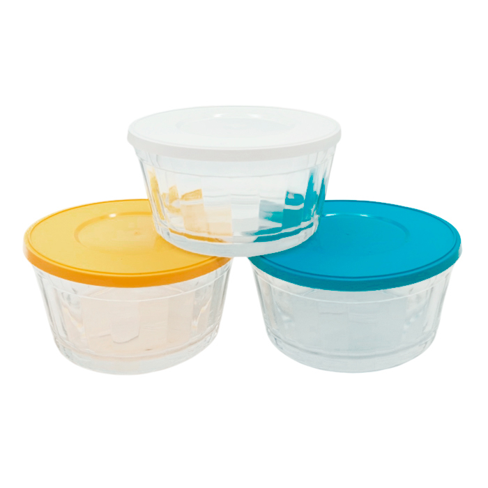 Bowl americano / Cuenco de vidrio facetado con tapa plástica.
