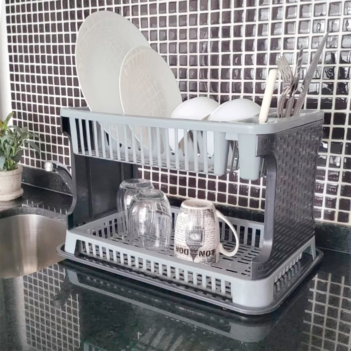 Escurridor de platos de plástico simil ratan de 2 pisos, con espacio para platos, vasos y cubiertos.