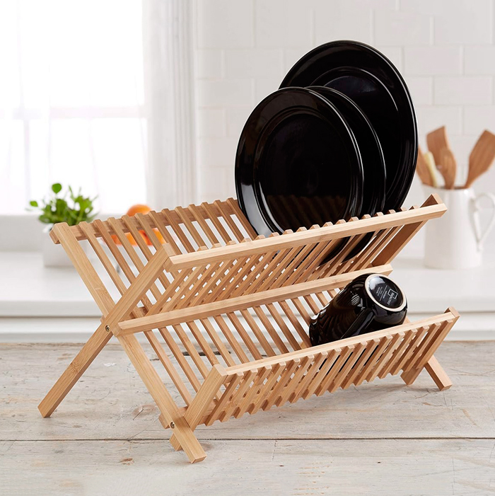 Secaplatos de 2 pisos de bambú plegable para 18 platos, con sección para tazas / vasos.
