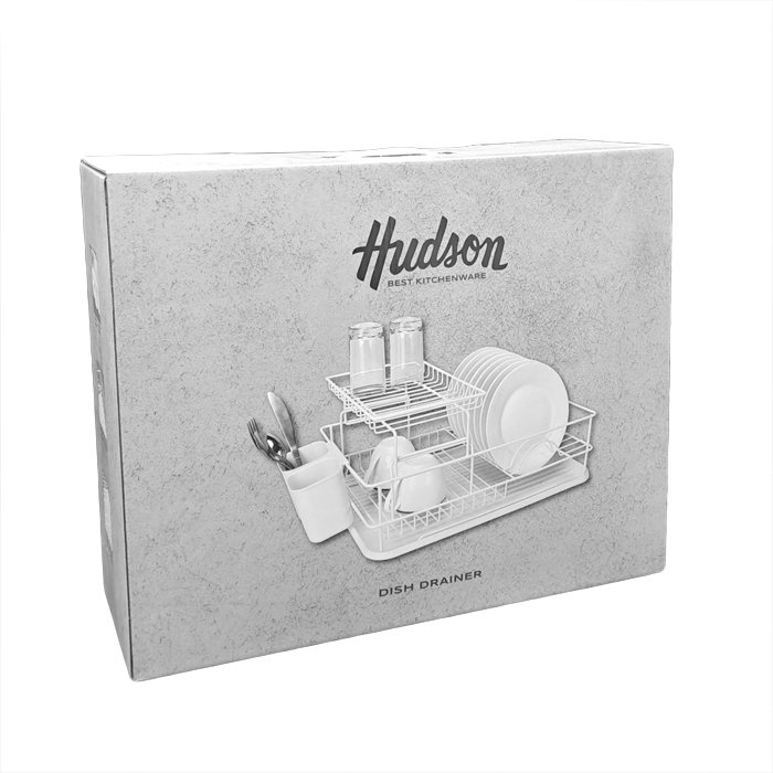 Escurridor de platos de acero blanco de 2 pisos con bandeja plástica y cubertero.
