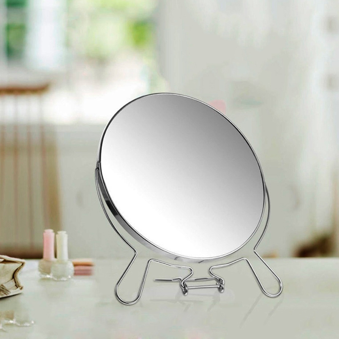 Espejo redondo de 6" doble faz, con aumento, con base metálica rebatible.