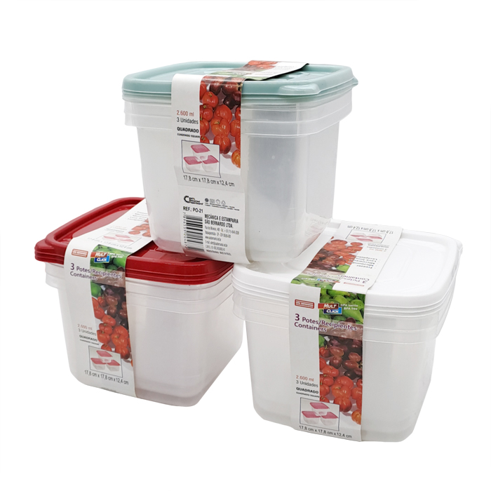 Set x 3 Recipientes / Potes / Hermeticos cuadrados de plástico transparente con tapa de color.