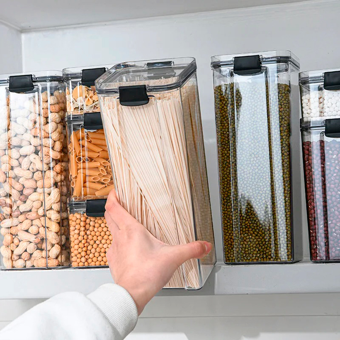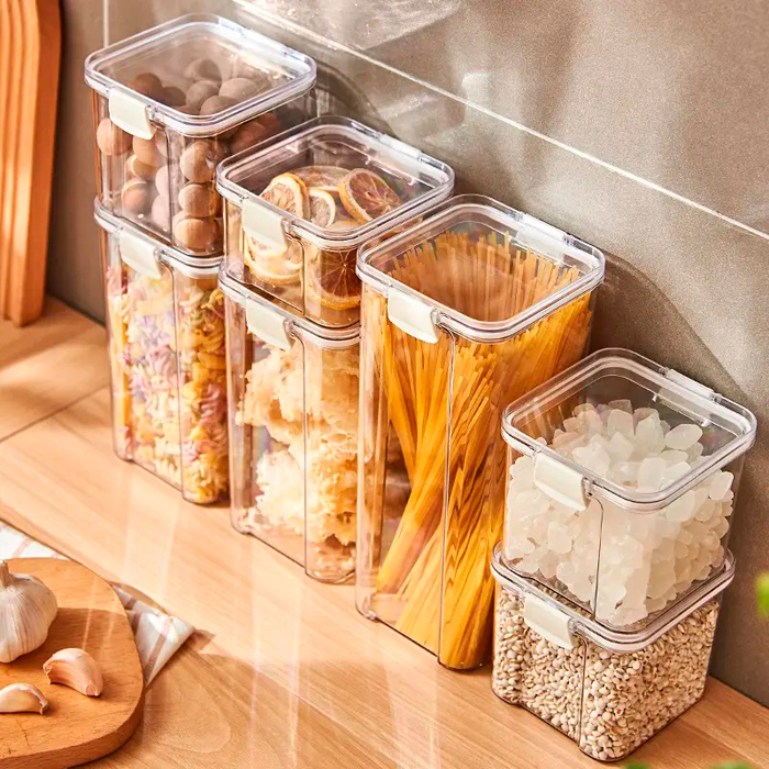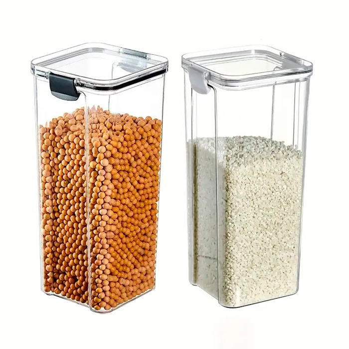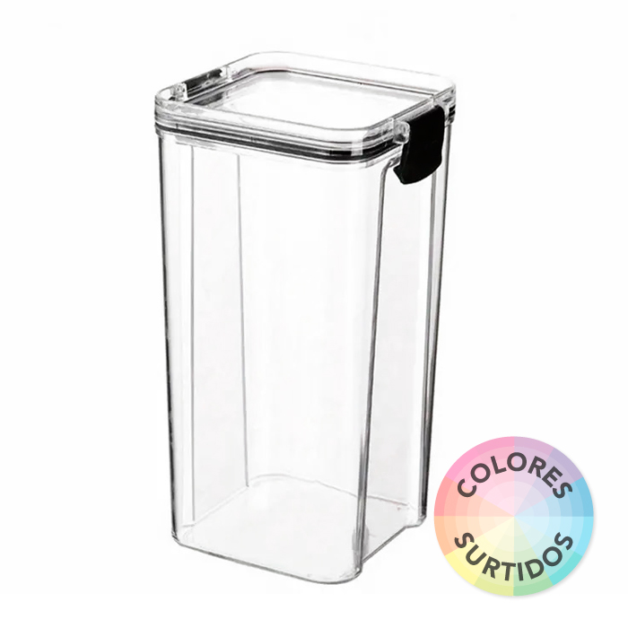 Tarro / Contenedor hermético de acrílico transparente con trabas clip. Apilables.