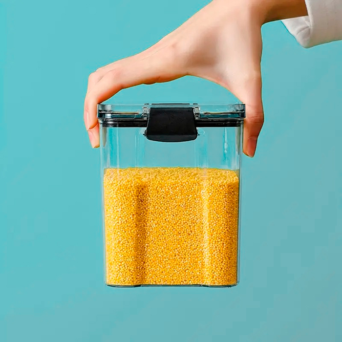 Tarro / Contenedor hermético de acrílico transparente con trabas clip. Apilables.