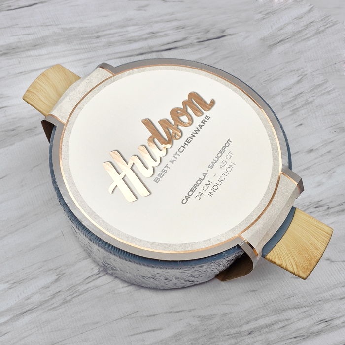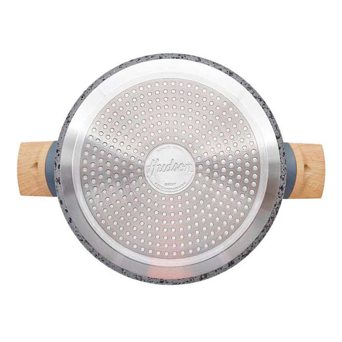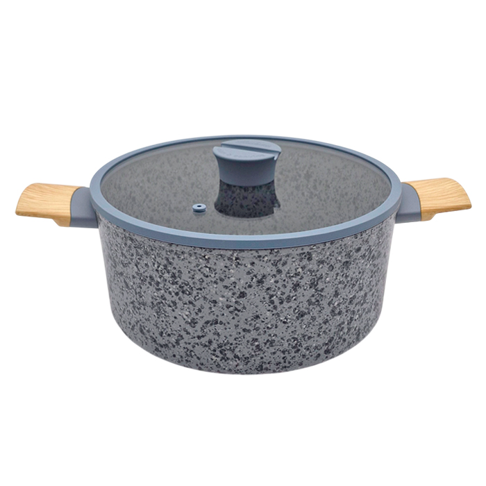 Cacerola de aluminio forjado de 2mm con 3 capas de antiadherente, con asas simil madera soft touch y tapa de vidrio con borde siliconado.