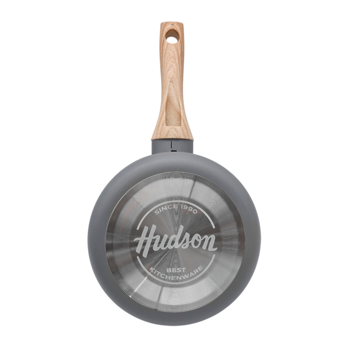 Cacerola línea granito, con mango de madera, de aluminio con triple capa antiadherente, tapa de vidrio y base espiral difusora de calor.