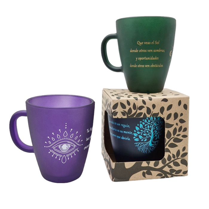 Taza de vidrio esmerilado con asa.