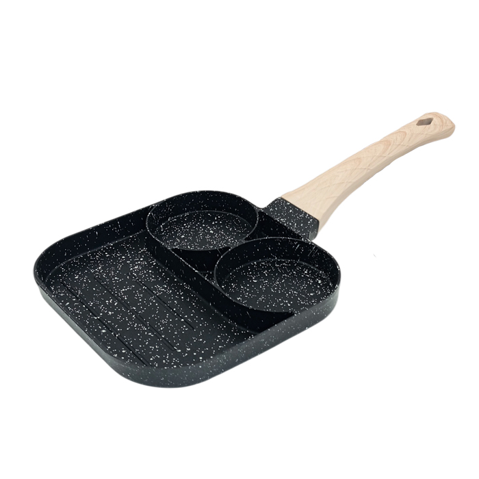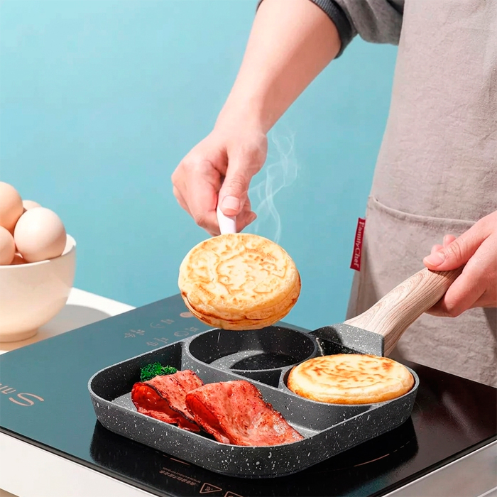 Sarten de aluminio con 3 áreas divididas con mango simil madera
