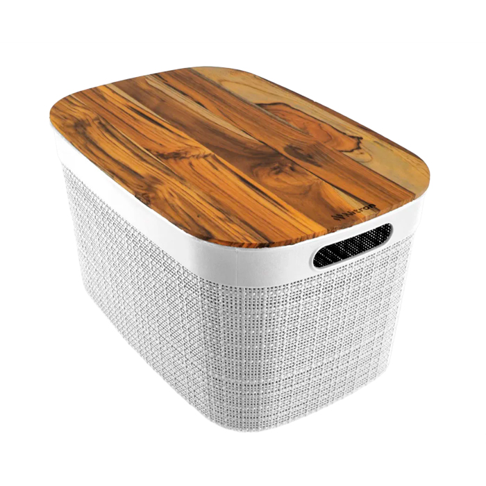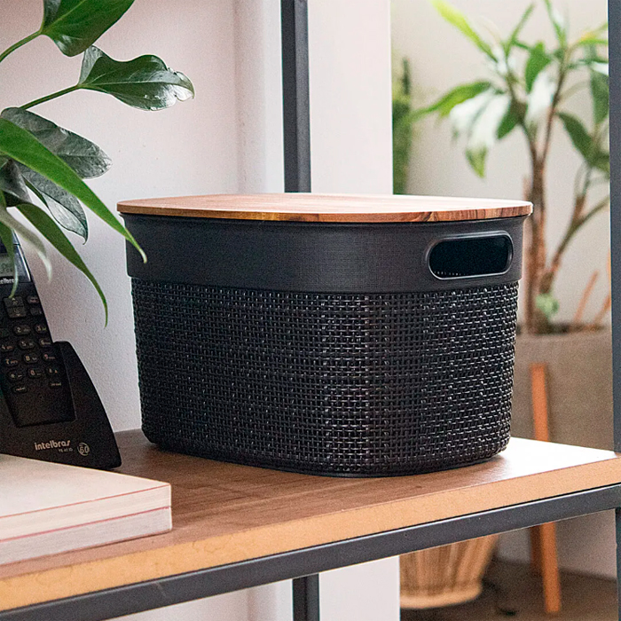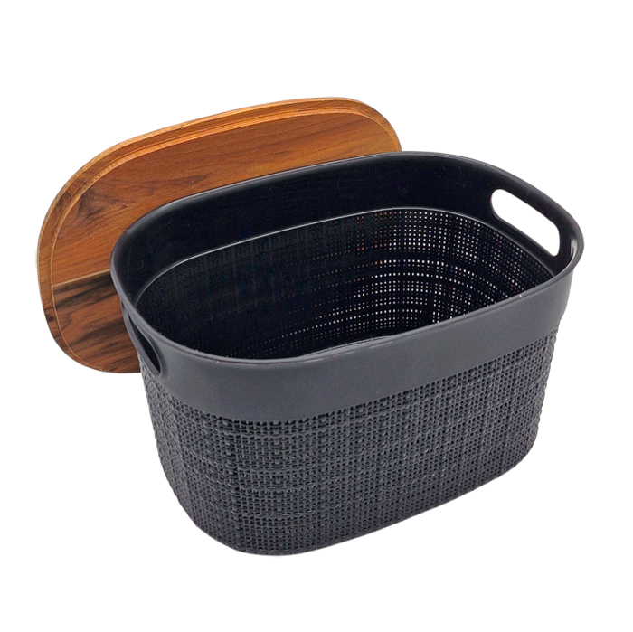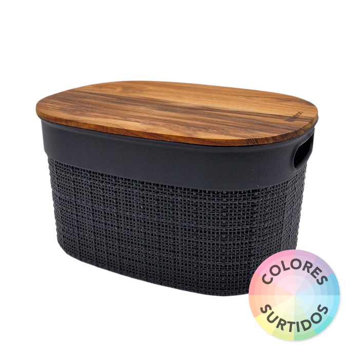 Canasto con bordes redondeados de plástico con tapa de madera.