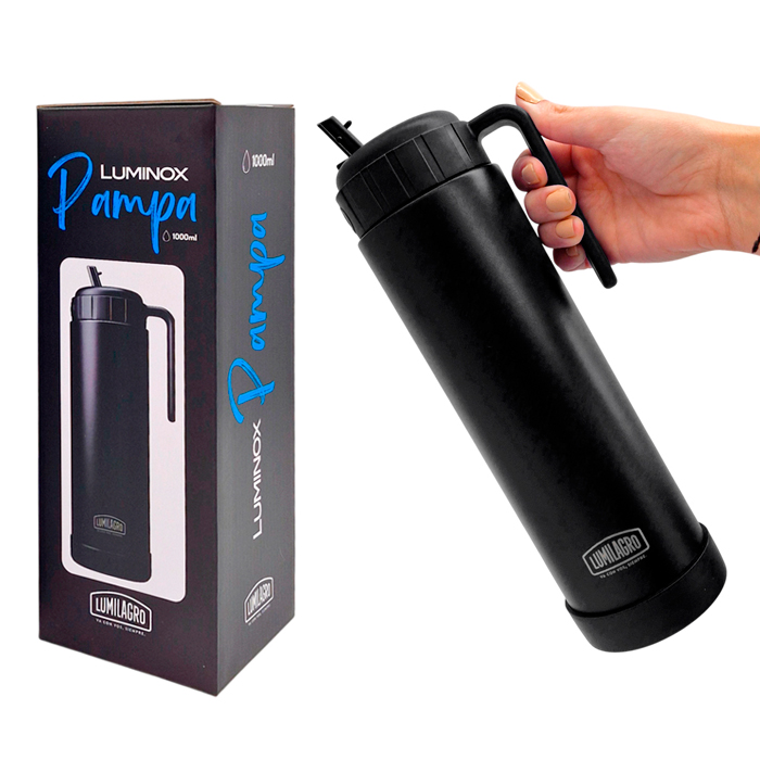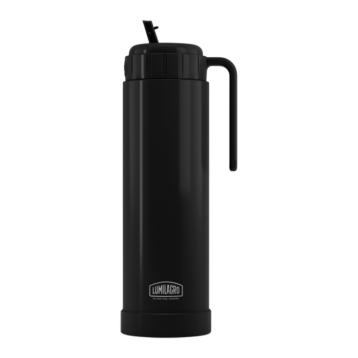 Termo de 1 litro, ultra liviano, de acero pintado con manija, interior doble pared de acero inoxidable 304 con pico matero retráctil.