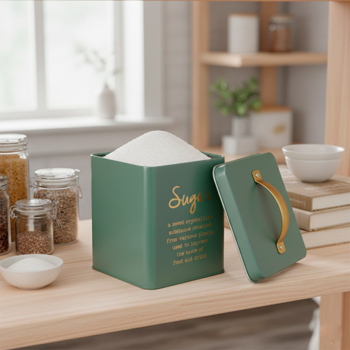 Lata cuadrada estilo vintage de acero pintado verde con tapa a presión y detalles en bronce.