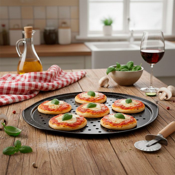 Pizzera perforada granito de acero carbono con recubrimiento antiadherente