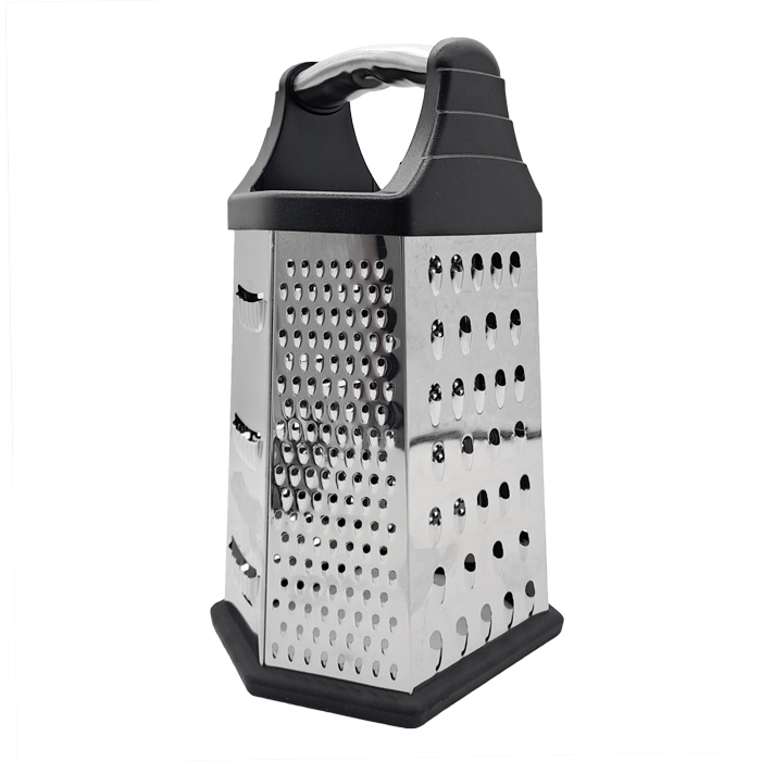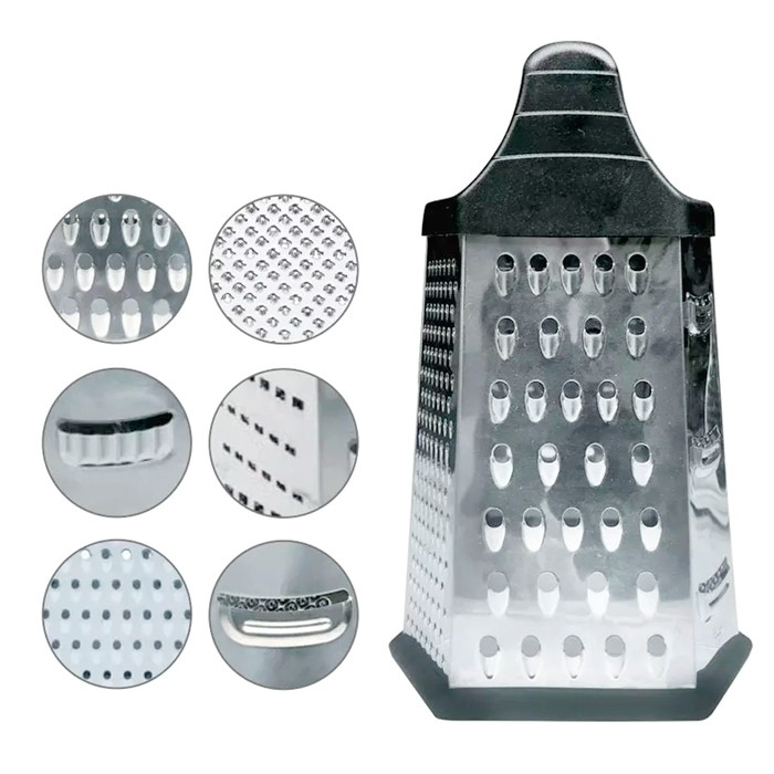 Rallador hexagonal de acero inoxidable con base de silicona antideslizante y manija plástica de alta resistencia.