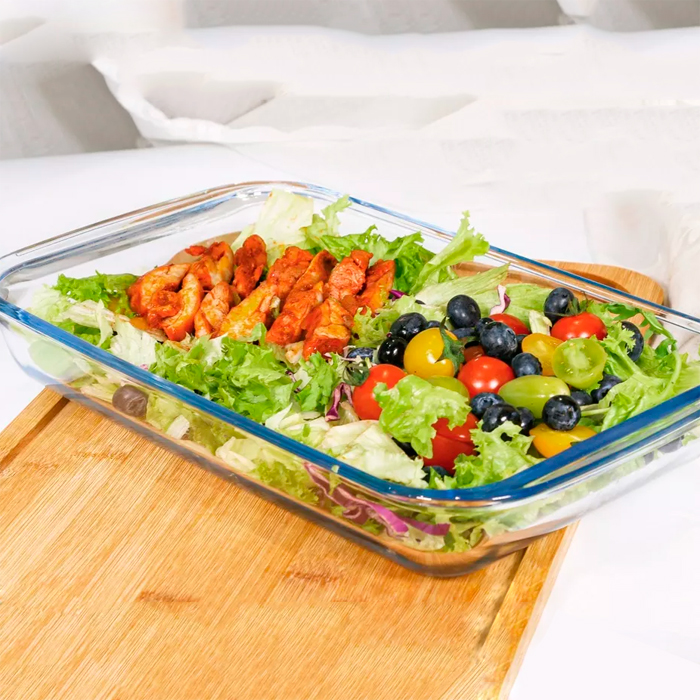 Fuente / Asadera de vidrio templado con Tabla de bambú como tapa.