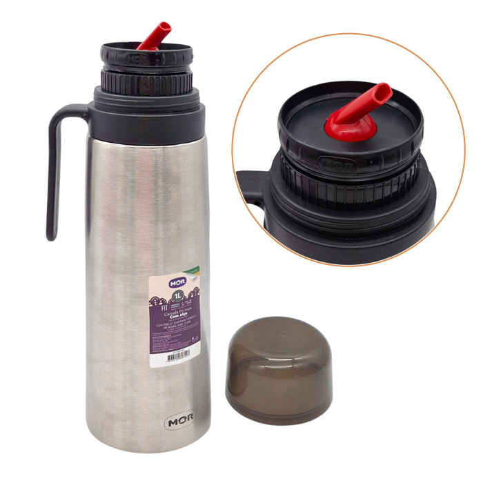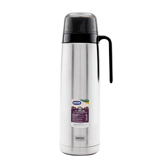 Termo de acero inoxidable de 1 lt con tapa de plástico, pico cebador y manija. Con base antideslizante.
