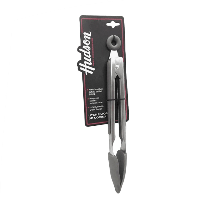 Pinza de acero inoxidable con agarre de silicona antideslizante y traba de cierre.