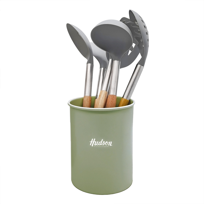 Set x6 utensilios de nylon con mango de madera + contenedor giratorio de metal pintado.