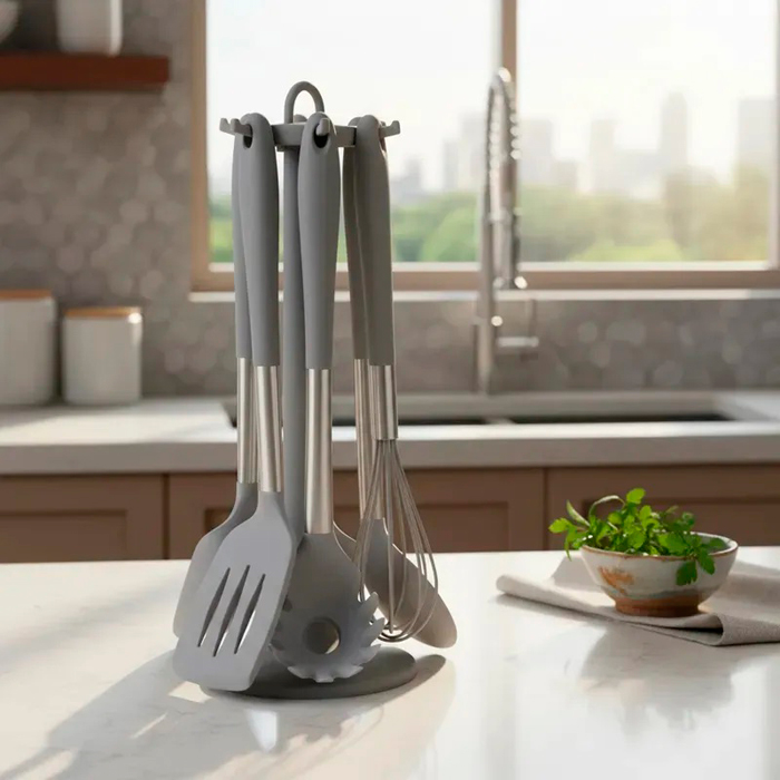 Set x 7 utensilios de acero inoxidable y silicona con soporte giratorio