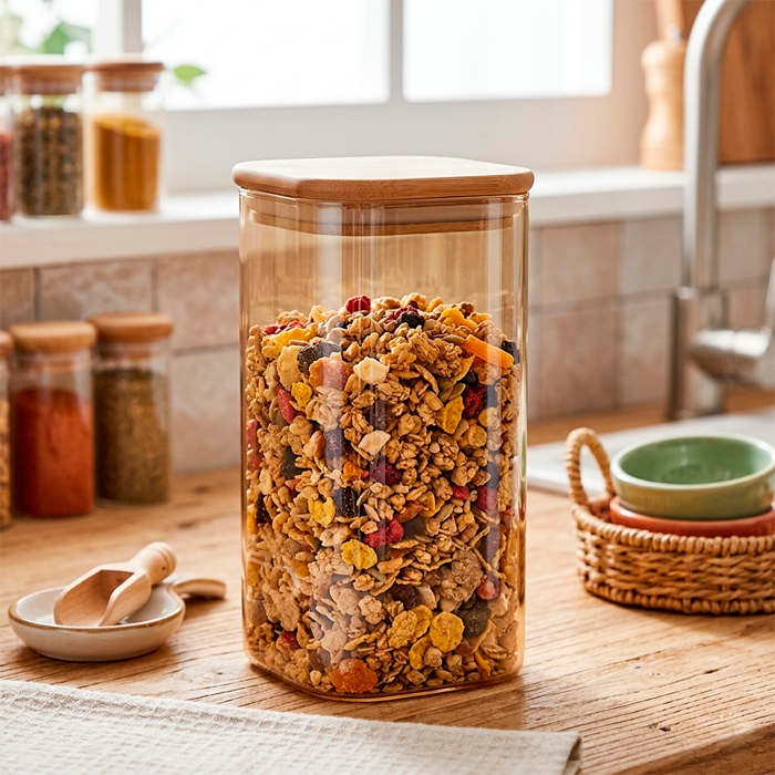 Frasco de vidrio cuadrado recto con tapa hermética de bambú.