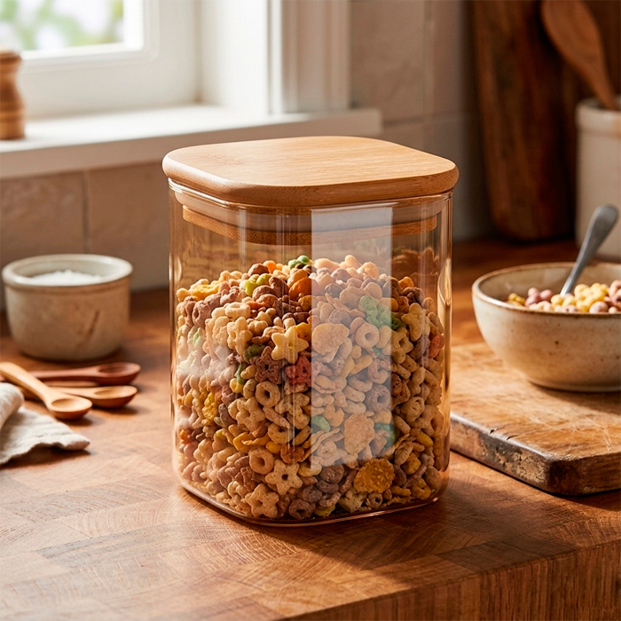 Frasco de vidrio cuadrado recto con tapa hermética de bambú.