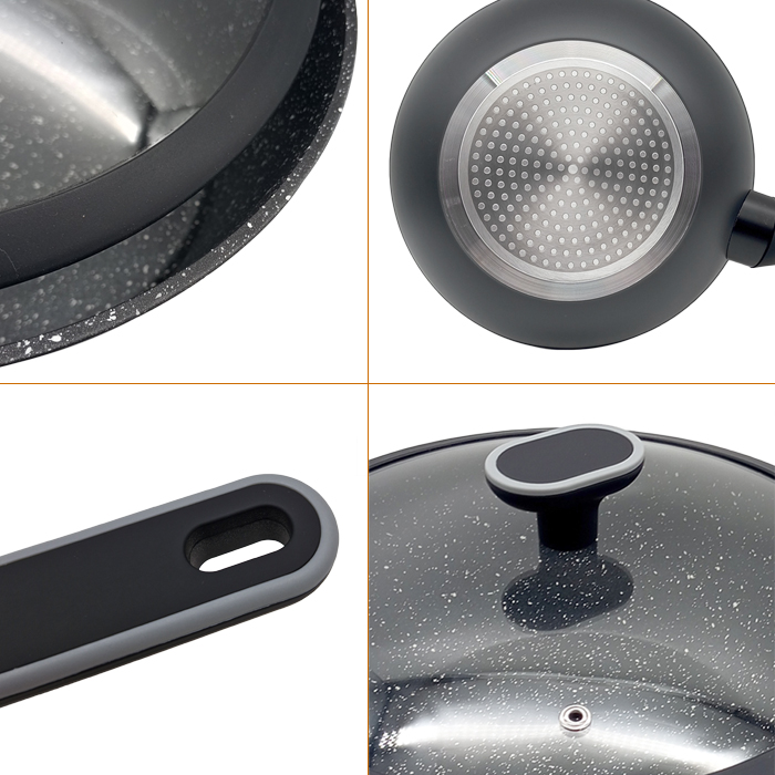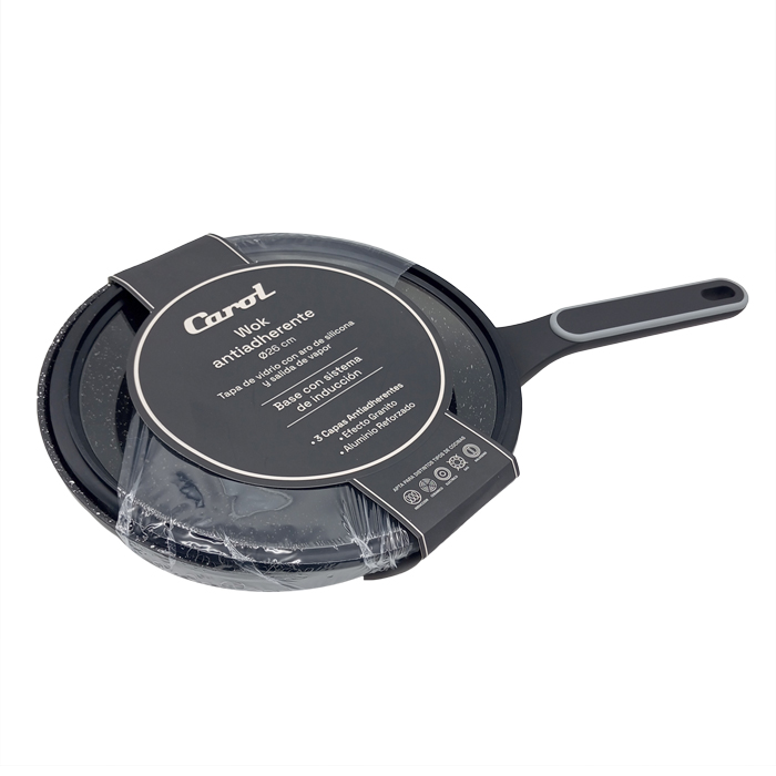 Wok de aluminio reforzado con triple capa antiadherente, tapa de vidrio con aro de silicona, válvula de vapor, base difusora de calor y mango soft touch.